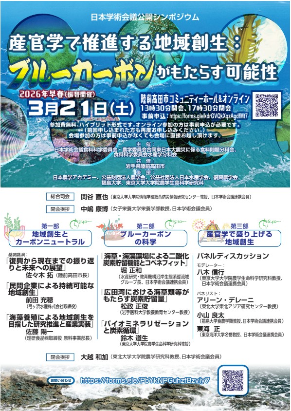 日本学術会議公開シンポジウム「産官学で推進する地域創生:ブルーカーボンがもたらす可能性」にて当社佐藤が講演します。【日時】