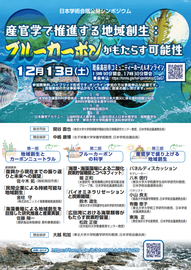 日本学術会議公開シンポジウム「産官学で推進する地域創生:ブルーカーボンがもたらす可能性」にて講演します。