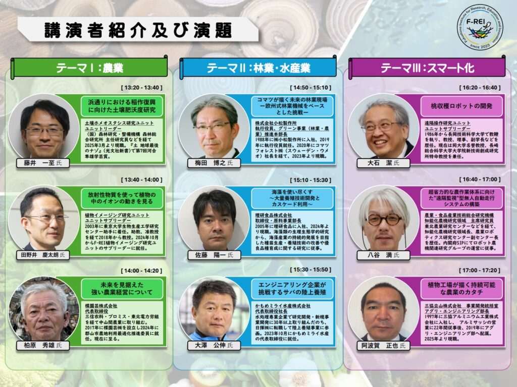 「農林水産業」分野を中心に「ロボット」、「エネルギー」、「放射線科学・創薬医療、放射線の産業利用」の各分野とも関連のある研究について、3つのテーマを軸に紹介されます。